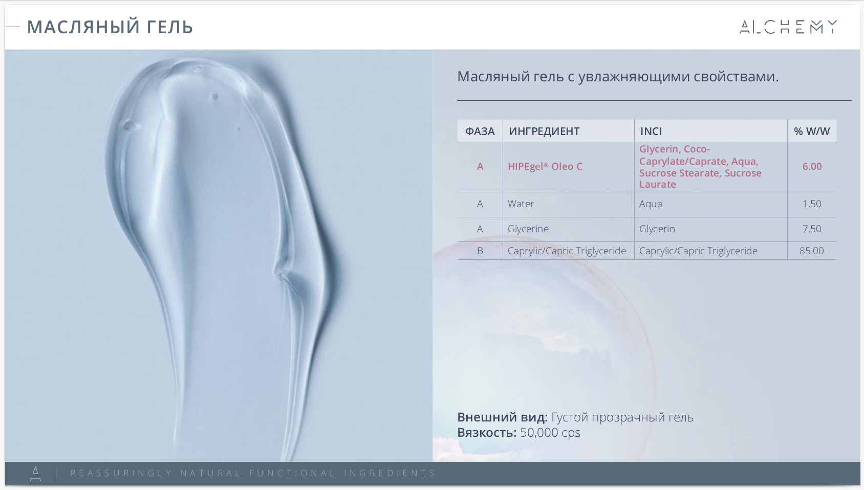 Гели на основе HIPEgel Oleo C по сравнению с рецептурами на Sucragel дают лучшее скольжение и приятную сенсорику. HIPEgel Oleo C позволяет создавать масляные гели с концентрацией масляной фазы 80-90%,обладающие уникальными легкими ощущениями на коже и "quick-break" эффектом (при нанесении на кожу гель превращается в масло, при добавлении воды — в эмульсию). Совместим со всеми типами масел, кроме высокополярных.